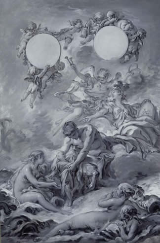The work is a grisaille (a painting done entirely in shades of grey, black, and white), a type of painting often used by Boucher as a preliminary sketch for later, larger color compositions. The AMAM painting, however, is a sketch Boucher prepared as part of a series of engravings depicting episodes in the life of King Louis XV (1710 - 74). Using the allegorical guise of the sea-nymph Thetis presenting her son Achilles to the centaur Chiron, who tutored the young hero, the painting represents the moment when the young Louis XV, age 7, was removed from the care of his female governess and given over into the care of men. Hovering behind the muscular centaur are Fame and Athena, goddess of wisdom. Above is a delightful chorus of 7 putti with copiously dimpled flesh, supporting garlands around empty spaces. In the final print, these spaces held depictions of the obverse and reverse of a medallion, showing the king and a scene from the Aeneid that alludes to the education of the young ruler.