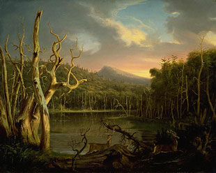 Although an unidentified reviewer commented in 1825 that the two deer "might have been omitted," as they detracted from a foreground that "has great beauties, but is not so perfect,"11 Kenneth Myers has recently argued that they are part of a sophisticated iconographic scheme.12 He suggests that Cole intended Lake with Dead Trees as a pendant to Kaaterskill Upper Fall, Catskill Mountains (bought by Trumbull in 1825). Although the latter work is now lost, it is known via a replica, Kaaterskill Falls, which Cole painted in 1826 for Daniel Wadsworth.13 The pendants both represent what was actually a settled mountain area as wilderness, with the dead trees in the Oberlin painting perhaps alluding to the effects of lumbering and tourism. And both paintings represent the passage of time through cloud movement, foliage color, and light, while the transition from death to life can be seen in the barren tree trunks at the far left of Lake with Dead Trees , and in the deer moving towards the right and towards the pendant Kaaterskill Falls, with its falling water and receding storm clouds. In Myers's interpretation the placement of the iconographic elements leads the viewer from contemplation of a beautiful, if threatened, wilderness to participation in a sublime vision.