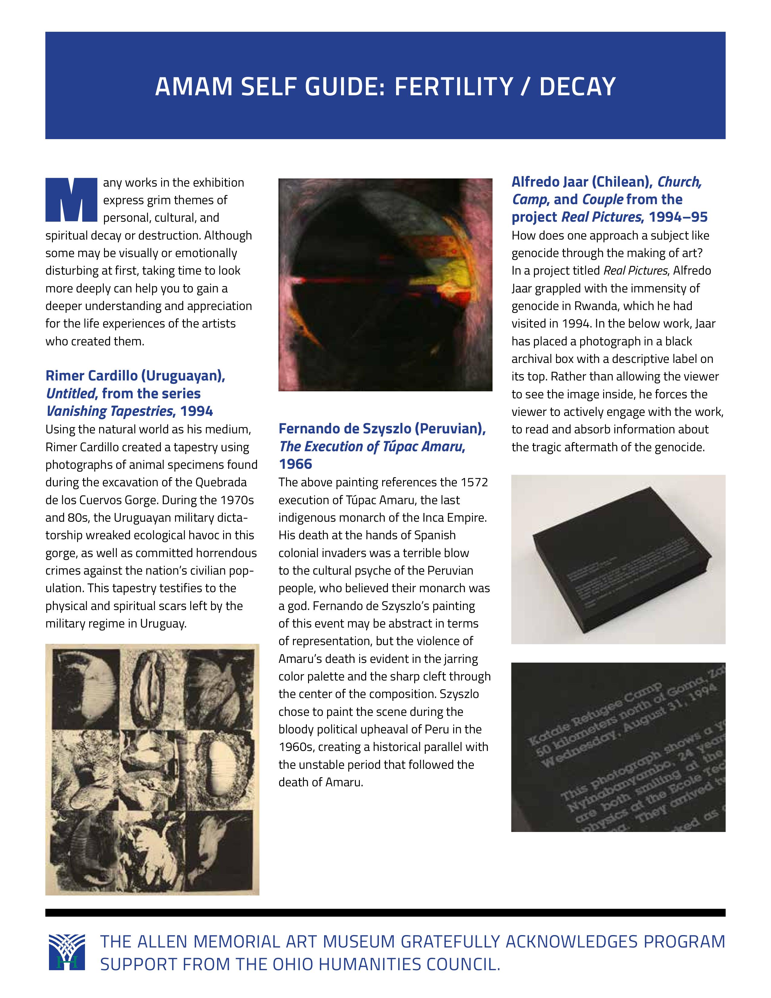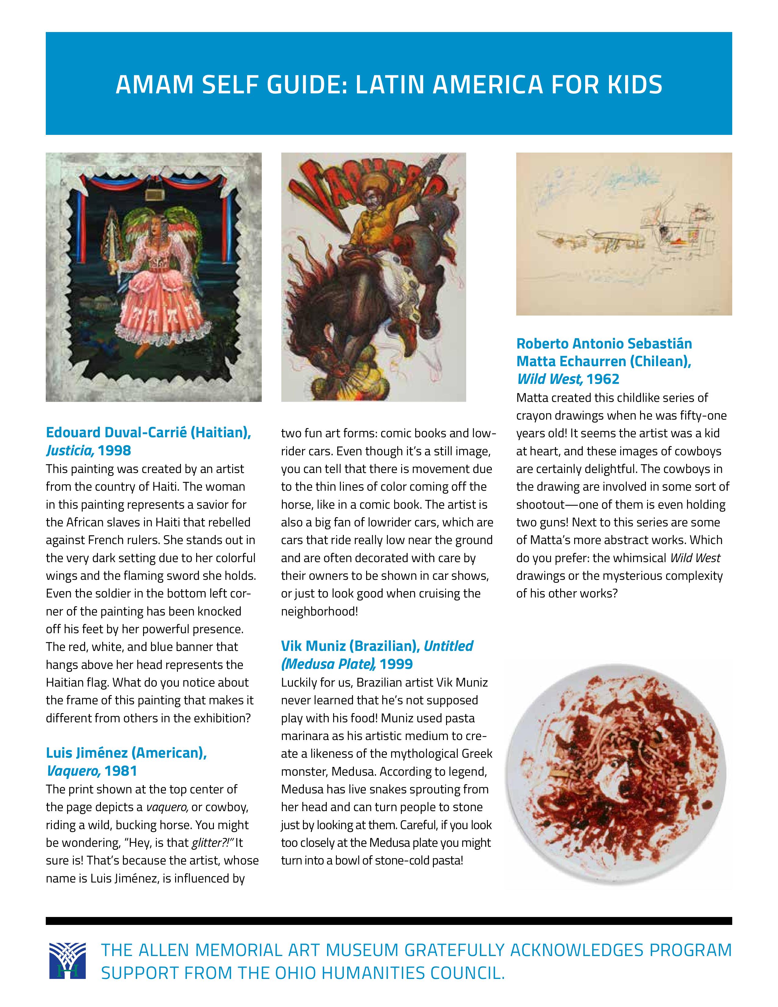 We've created five new gallery guides to go along with the exhibition Latin American and Latino Art at the Allen. These guides explore the themes of geography, the influence of indigenous art, artwork of US artists of Latin descent, Fertility and Decay, and a special guide just for kids. Grab them individually below, or download a PDF version with all the guides included by clicking here.