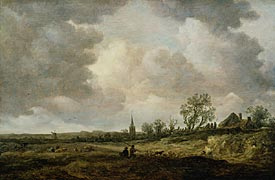 Jan van Goyen was the master of the tonalist landscape, using a limited palette of muted colors to describe the subtle, atmospheric beauties of the Dutch countryside. Landscape with Dunes, a mature work by the artist, uses vertical elements and contrasts of light and dark to break up the horizontal sweep of the land.