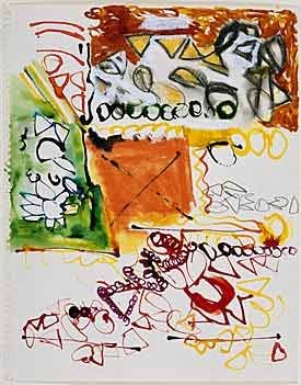 In the lower right, the sprawl and crowding of ungrounded forms work against the gridlike organization above. The result is an engaging play between elements that seem applied to a plane or surface, and emergent marks of color that seem to float "off" and away from the format of the page. It should be noted that during this period Hesse frequently turned the sheet while drawing. Many unsigned and notebook drawings of 1962-4 may have more than one plausible orientation. It is possible, for examble, to view the Oberlin sheet with the notebook edge on top, rather than on the left.