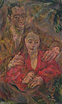 The second Sposalizio, or self portrait with Alma, marks the beginning of a new phase in Kokoschka's work, marked by heightened color as well as richer nuances of individual shades.8 In contrast, the Oberlin Sposalizio is one of the opaque portraits of 1911-12, an earlier group characterized by dark colors and heavy impasto.