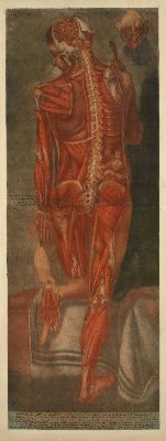 Jacques-Fabien Gautier-Dagoty (French, 1716–1785) Man Seen from the Rear, Ecorché and Dissected, Except for the Right Arm and Face, Kneeling on a Bench, 1759