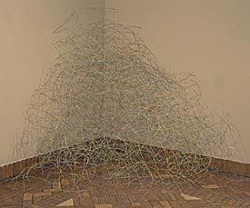 When installed, some of the wire sections can be hung from the wall, extending down and out onto the floor. The sculpture can also, as here, be installed by piling all of the sections together on the floor.