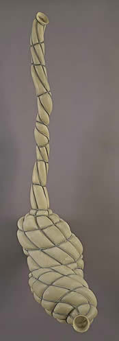 bulgebone is one of Shelton's several lead and fiberglass works of 1990-93, all of which (like much of his sculpture in other media) conjure up slightly dysfunctional organs and/or machine parts; compare, for example, u-bone with drain (1990-92), or whitebagbone (1992-93).2 The lead and fiberglass pieces from Shelton's "bone" series are one manifestation of his focus on conduit and tube forms, highly abstracted elements that reflect "a pneumatic or hydraulic vessel, a collector or condenser, a passage in its different scales, a ‘tube' that you pass through, a tunnel, a hallway, a pipe. You could think of them in terms of a circulation system."3