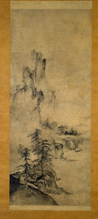 This scroll represents the Japanese painting genre known assuibokuga, literally meaning "water and ink painting."1 Suibokuga was derived from twelfth- and thirteenth-century Chinese painting styles transmitted to Japan via merchants and monks during the thirteenth and fourteenth centuries. Initially this style of painting was practiced in Japan mainly at Zen temples, but later it also came to be appreciated by the Shôgun and other secular aristocrats. The earliest suiboku paintings were primarily religious images; however, beginning with Tenshô Shûbun (1414-1463), landscapes also became an important subject for artists working in this style. Shûbun was the teacher of Sôtan, to whose hand this scroll is attributed. Thus, if the attribution is correct, the Oberlin scroll represents an early stage in the development of suiboku landscape painting in Japan.