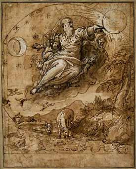 Finally, perhaps to subtly convey the impression of a vault open to the sky or the opening of a cupola, Zuccaro chose a round format for his scene, rather than Michelangelo's rectangular design. This decision was evidently made late in the creative process, for chalk lines around the edges of the drawing indicate a rectangular frame. Snakes, fish, shells, and other elements of marine life, originally inked in at the lower border, are truncated by the circular border of the final design, and the sun, once depicted with a complete smiling face, is cut off (see Technical Data).Related to the Oberlin drawing is a schematic design for the entire ceiling of the chapel of the Palazzo Farnese executed by Giovanni Antinoro (active ca. 1566), an artist in the Zuccaro circle also active on the commission.4The Oberlin drawing was formerly attributed to Titian, when it was owned by the Earls of Pembroke at Wilton House.5 Collobi (1938) first identified it as Zuccaro's drawing for the fresco at Caprarola.6