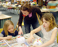 - Once all lines are drawn satisfactorily, select colors (it is best to work from light to dark) and begin to paint them in the appropriate spaces according to the design. (Remember: no paint is needed for white since the mask itself is a nice bright white!)