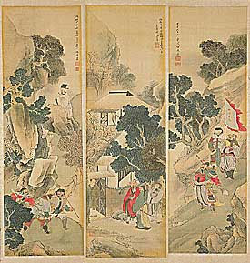 The central scroll depicts Liu Bei (162-233), Guan Yu (d. 219), and Zhang Fei (d. 220), three generals and statesmen of the later Han dynasty. In this scene they are shown visiting a fourth general and scholar, Zhuge Liang (181-234), to persuade him to abandon retirement and help them establish the kingdom of Shu as successor to the Han. According to legend, they had to plead with him three times before he agreed to join their cause. All four men eventually became archetypal figures of loyalty and valor, and their exploits were popularized in the historical novel Sanguozhi (The Romance of the Three Kingdoms), which may have provided the inspiration for this painting.