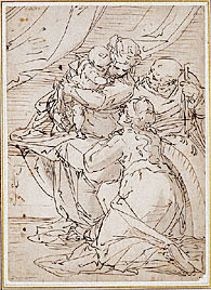 The compositional power and directness of Cambiaso's drawing represents a return to canonical High Renaissance groupings of the Holy Family, and a move away from Mannerist complexity. The compact massing of the monumental figures, generously swathed in drapery, ultimately derives from Leonardo da Vinci's figural inventions for devotional subjects, as further developed by Michelangelo and Raphael. 1 The intensity of the figures' gazes--Joseph leaning forward to look at Mary and the Christ child; the Mother and infant bending towards the kneeling, supplicant Catherine--further unifies the composition. The simplicity, clarity, and spiritual impact inherent in this work were qualities sought by artists affected by the goals of the Counter Reformation.