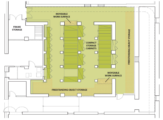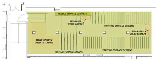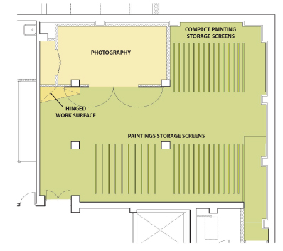 Painting Storage will be renovated to provide more usable space. The addition of work surfaces will enable safe handling of artworks during examinations and preparations for exhibitions and loans. Inadequate lighting will be replaced with suspended linear fluorescent fixtures with direct and indirect distribution and sleeves for filtering ultraviolet light.