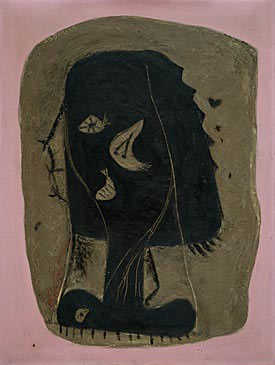 were also deeply involved in the study of myth as a vehicle and repository of "primal" human expression.2 It was during this period that Gottlieb began to paint the works that he called "pictographs": paintings whose titles often invoked mythic figures and tragedy, and whose simplified, flat, totemic forms drew on various sources of archaic and tribal art. Closely related to the Oberlin canvas is his Persephone of 1942.3 According to Stephen Polcari, Persephone's jagged, right-facing profile, which also appears in Oberlin's Rape of Persephone, was inspired by one of the African carvings in Gottlieb's collection.4 In reworking the Persephone theme in 1943, Gottlieb simplified the contours of the centralized figure, reduced its internal forms and lines, and created a consistently colored ground for the scratched and painted signs.5