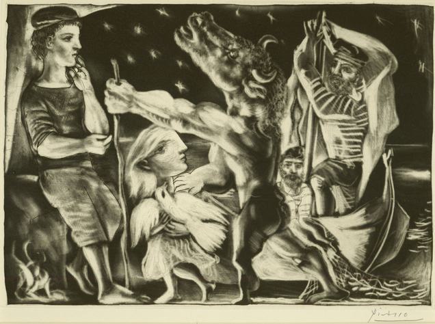 Blind Minotaur Led through the Night by Girl with Fluttering Dove