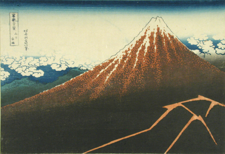 Katsushika Hokusai (Japanese, 1760 - 1849) Rain Beneath the Peak (Fuji over Lightning), from the series Thirty-six Views of Mt. Fuji, early 1830s Color woodblock print Overall: 9 3/16 x 14 9/16 in. (234 x 370 mm) Mary A. Ainsworth Bequest, 1950 1950.712 |