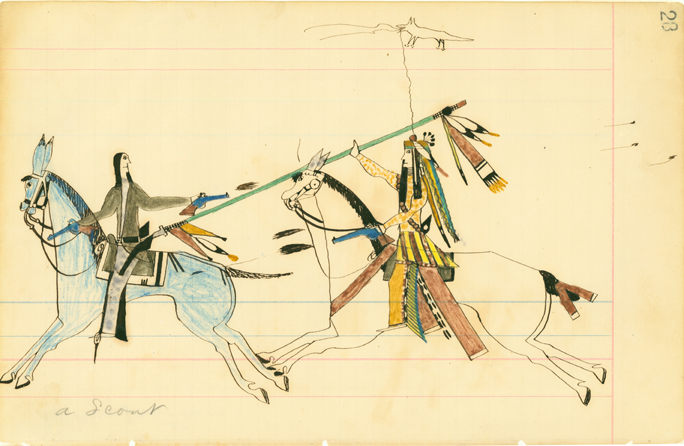 Howling Wolf (Southern Cheyenne, 1849 - 1927) 46. Ute Indian; 45. [blank page]; 27. [blank page]; 28. A Scout, 1874 - 1875 Pen, ink and watercolor on ledger paper Overall: 7 7/8 x 12 3/8 in. (200 x 315 mm) Gift of Mrs. Jacob D. Cox, 1904 1904.1180.11 |