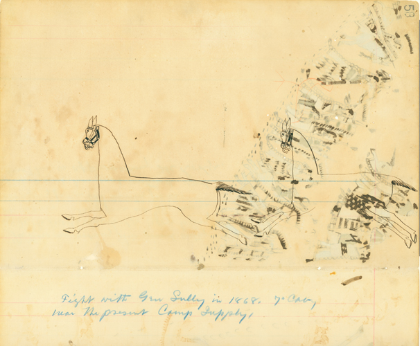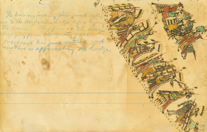 Howling Wolf (Southern Cheyenne, 1849 - 1927) 57. The warriors making their grand entry into the Medicine Lodge before beginning the dance. They fire first at the image hanging from the center pole. One band has just arrived and another is approaching the Lodge; 58. Two Horses; 63. [blank page], 1874 - 1875 Pen, ink and watercolor on ledger paper Overall: 7 7/8 x 12 3/8 in. (200 x 315 mm) Gift of Mrs. Jacob D. Cox, 1904 1904.1180.14 |