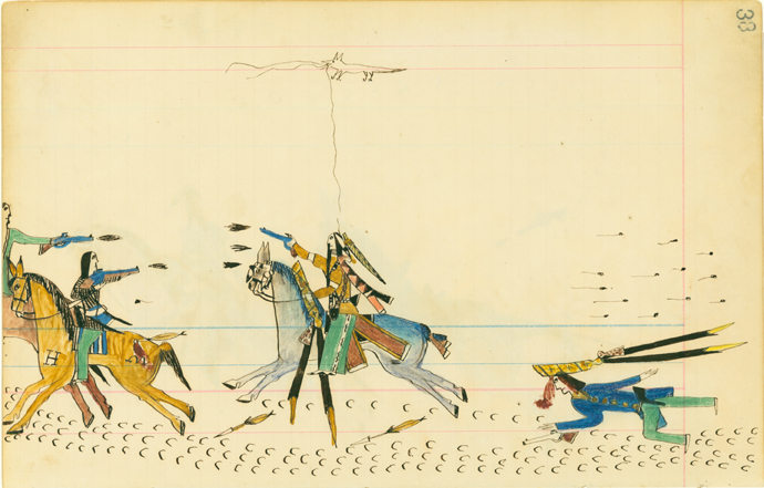 Howling Wolf (Southern Cheyenne, 1849 - 1927) 38. Howling Wolf Fighting Soldiers; 37. [blank page]; 35. [blank page]; 36. Howling Wolf Killing Soldier, 1874 - 1875 Pen, ink and watercolor on ledger paper Overall: 7 7/8 x 12 3/8 in. (200 x 315 mm) Gift of Mrs. Jacob D. Cox, 1904 1904.1180.8 |