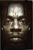 Willie Cole, American, b. 1955 Man, Spirit, and Mask, 1999 Etching, woodcut, embossing, hand-coloring Paper: 39 3/16 x 26 9/16 in. (995 x 675 mm) Image: 38 1/8 x 25 9/16 in. (968 x 650 mm) Ruth Roush Fund for Contemporary Art, 2000 AMAM 2000.5A-C