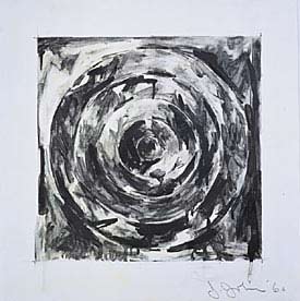 Materials and procedures are always matter-of-factly visible in Johns's work, and this sheet presents the purposeful accumulation of marks and tones that the paper has absorbed from the medium's black-to-white, viscous-to-fluid spectrum. As in most of Johns's target images, the drawing works against the target as a hierarchical configuration of concentric circles that culminate in a single point at dead center. The viewer is compelled to scrutinize the target as a complex field of positioned tonalities and textures. The result is less an "image of" a target than an insistently material object, a particular target that has been drawn and configured by the contrast, merging, and gradation of half-transparent, half-opaque deposits of black, white, and grey pigment.