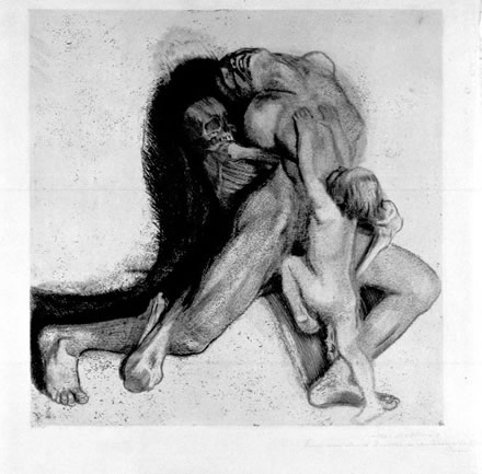 Kathe Kollwitz (German, 1867 - 1945) Death and the Mother, 1910 Etching and roulette (with some aquatint and scraper) Plate: 17 11/16 x 17 11/16 in. (45 x 45 cm) Paper: 23 5/8 x 21 1/16 in. (60 x 53.5 cm) Friends of Art Fund, 1952 AMAM 1952.27