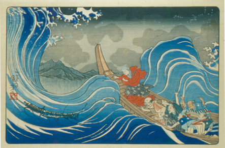 Utagawa Kuniyoshi (Japanese, 1797 - 1861) The Sacred Mantram Appears to Nichiren in the Waves Off Sumida, from the series A Short Pictorial Biography of the Founder of the Nichiren Sect, mid 1830s Color woodblock print Overall: 10 1/8 x 14 1/4 in. (257 x 362 mm) Gift of Sarah G. Epstein (OC 1948), 1997 1997.41.83 |
