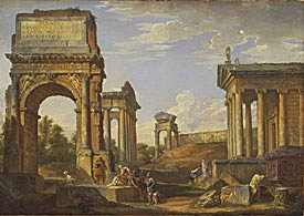 The Oberlin painting represents the type of picturesque veduta for which Panini was best known: an idealized, fanciful recapitulation of the Roman forum, the vedute ideate juxtaposes the most beautiful and famous monuments of antiquity with blithe disregard for topographical accuracy. Panini's romantic compilations of ruined monuments were especially popular with English and French visitors to Rome who desired evocative souvenirs of the classical sites visited during their Grand Tours.1 Indeed, several foreign patrons commissioned specific vedute from the artist.2