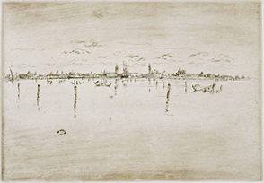 A third group of images is comprised of daylight 4 and nocturnal 5 views in which the city seems to float on the water. Little Venice, the most successful of the daytime views, includes such famous and recognizable sites as the Public Gardens on the left, Santa Maria della Salute, and the campanile and dome of San Giorgio Maggiore. Yet the scene is presented in reverse--Whistler drew what he saw directly on the plate; in printing the image is reversed--and the buildings are reduced to vertical punctuation marks on a narrow horizontal strip. The real subject of the image is the light-filled Venetian sky and the watery expanse between Venice and the island on which Whistler stood. Above and below the city the sheet is ostensibly empty, except for lightly indicated, exquisitely placed pilings, gondolas, building reflections, and, most prominently, the Whistler butterfly signature, in the water; and a few scribbled clouds in the sky.