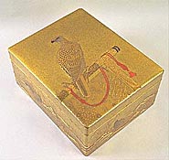 Primitive lacquering was known in Japan as early as the third century B.C., but did not develop into a significant art form until the introduction of Chinese lacquering techniques in the seventh or eighth century A.D. Japanese craftsmen quickly developed the art in new ways, and by as early as the tenth century A.D. a uniquely Japanese style of lacquer work had already appeared. The most distinctive characteristic of Japanese lacquers is the extensive use of the maki-e, or "sprinkled picture," technique. Maki-e lacquers are created by sifting powdered gold, silver, or copper through fine bamboo tubes onto a wet lacquer surface to create a design. Once the lacquer has dried, the design can either be polished flush with the surface of the vessel (hiramaki-e), built up with extra layers of lacquer and powders to create a relief effect (takamaki-e), or covered over with additional coats of lacquer which are then partially ground away to give the appearance of the design emerging from the surface of the vessel (togidashimaki-e).