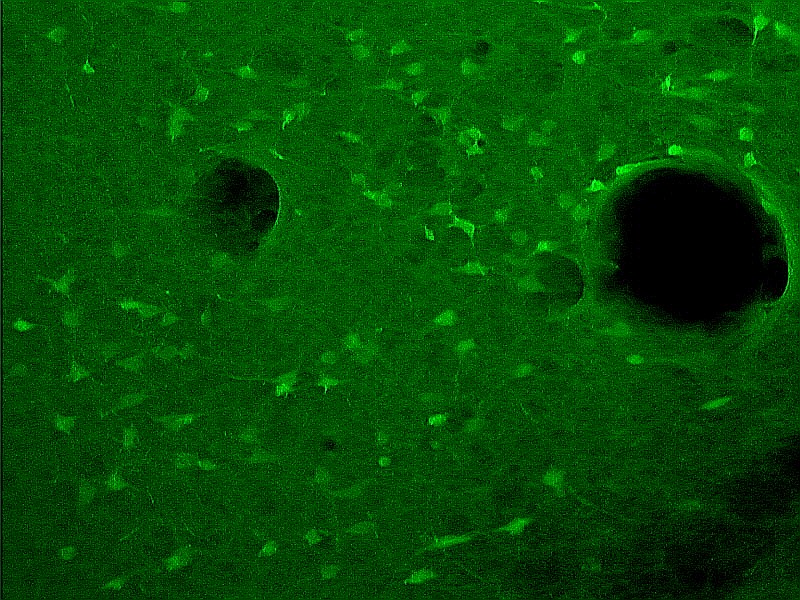 ![]() 6-OH dompamine injection site in the substantia nigra of a rat, showing degenerating dopamine cells, stained with a polyionic fluorescein stain called Fluor-Jade B. |