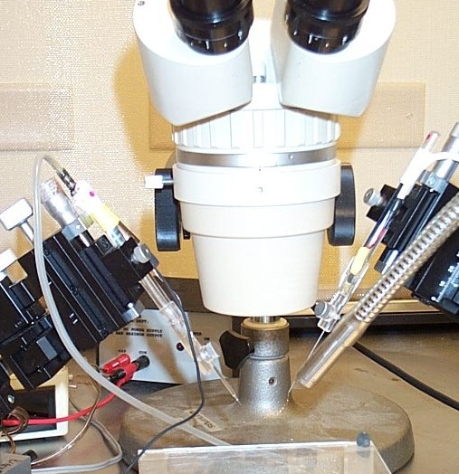 ![]() Set-up for voltage clamping of Xenopus eggs to monitor Na+, K+ and Ca++ fluxes. |