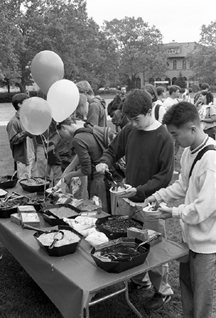 Sundaes on Friday: Hungry students dig in at the Fall Sports Ice Cream Social sponsored by the Oberlin College Athletic Department. The Wilder Bowl event took place in time to celebrate the end of the Yeomen football team's 40-game losing streak. (photo by John Matney)