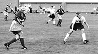 Ready, aim, fire!: An opposing winger launches an offensive assault upon the Oberlin field hockey team. (photo by Beth O'Brien)