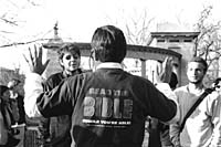 G'd is my co-pilot: A fundamentalist preacher known as "Brother Jed" descends upon the campus, spreading his message of peace, love and homophobia to an attentive group of bemused students. He would proceed to spend the entire day reading from the Good Book and answering questions. (photo by Pauline Shapiro)
